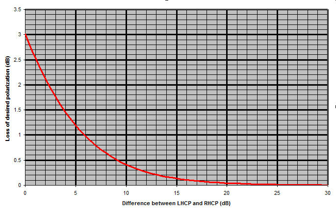 For example, if you look at an EME signal and find that it measures -10dB when decoded at the LHCP (Rx) port of a septum feed, and then you look at the signal at the RHCP (Tx) port of the feed and find that it measures -16dB, then you are seeing a 6dB difference between the ports. So in this case, the desired signal at the Rx port has 4 times the power of the undesired (lost) signal as measured at the Tx port. So you only see 4 "power units" out of the total of 5 "power units". If those 4 "power units" correspond to -10dB, all 5 "power units" would correspond to about -9db, so you would have lost 1dB of signal (10*log10(5/4)) to the orthogonal polarization mode. Whatever caused polarization to shift from the desired 100% LHCP circular to other modes (which can be considered as elliptical, RHCP or linear), resulted in 1dB loss of signal (and hence decode sensitivity) at the Rx port.