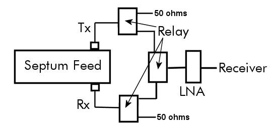 Most systems will have an isolation relay which switches the input to the LNA from the RX port to a 50ohm load. Most systems will have (or should have) the ability to do this switching manually in order to measure the ratio of sky noise to 50ohm noise (an important parameter in system optimization). So you simply remove the 50 ohm load and replace it with a connection to the Tx (RHCP) port. The you can switch between LHCP (rx port) and RHCP (Tx port) and compare the decode strength of a signal (e.g. a station calling CQ) on the two ports. IMPORTANT - to make the measurements easier and avoid the need for corrections, the connection the both ports from the relay should be as similar as possible in terms of loss. That ideally means the same length of the same type of coax with the same connectors and a minimum of adapters. So the setup would look something like this: