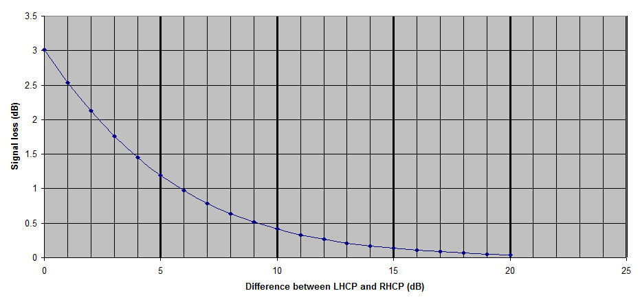 So you can see, for example, that if the signal you are receiving is linear (i.e. the Axial ratio is 0dB), then you get the expected 3dB loss). If the difference is 10dB or more, then you lose less than 0.5dB of the incoming signal energy at the desired port (Rx port, LHCP). Remember, these are theoretical results for receiving perfectly CP transmissions, but they give a fair indication of what what you might expect to find for at least some "real world" situations.